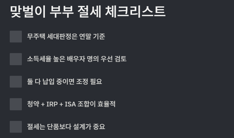 결론부터 말하면, 소득세율이 높은 배우자가 공제 역할을 맡는 것이 유리한 경우가 많으며, IRP·ISA와 함께 설계할 때 절세 효율이 더 커집니다.