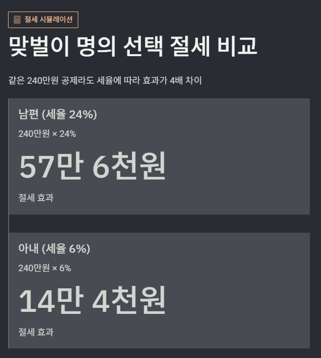 반대로 종합소득 범위·공제 한도 등에서 걸리면 세율 낮은 배우자로 분산이 더 나은 경우도 있습니다.