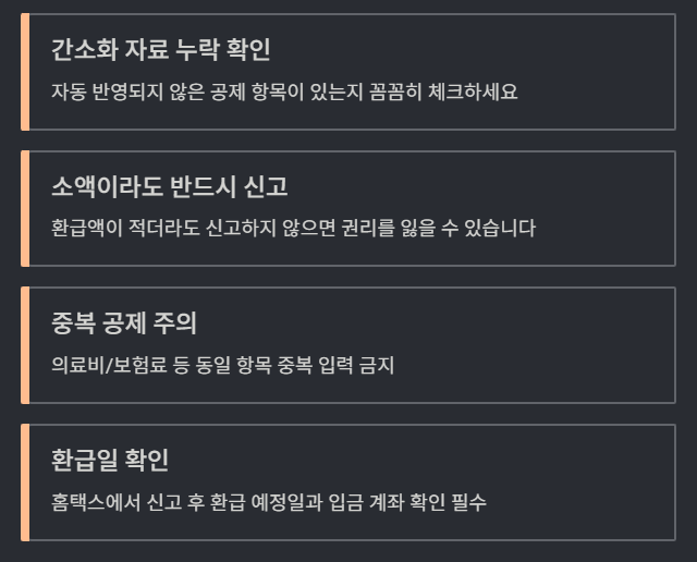 - 공제 항목 입력 시 중복 공제 주의 (예: 의료비/보험료)