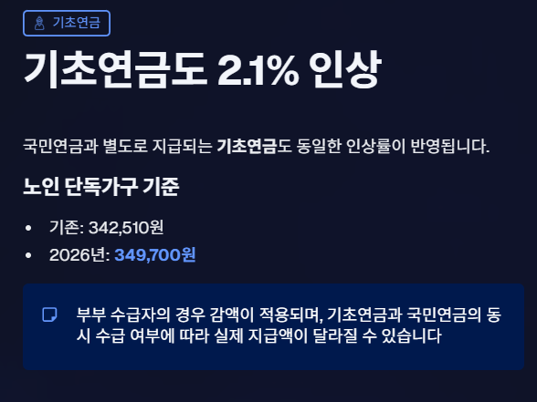 2026년 인상률 2.1%는 전년도 소비자물가상승률에 기반하며, 기존 수급자 약 752만 명이 적용 대상입니다.