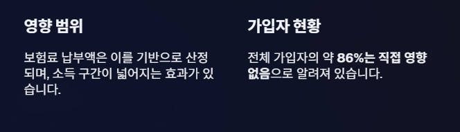 보험료 납부액은 이를 기반으로 산정되며, 소득 구간이 넓어지는 효과가 있습니다. 다만 전체 가입자의 약 86%는 직접 영향 없음으로 알려져 있습니다.