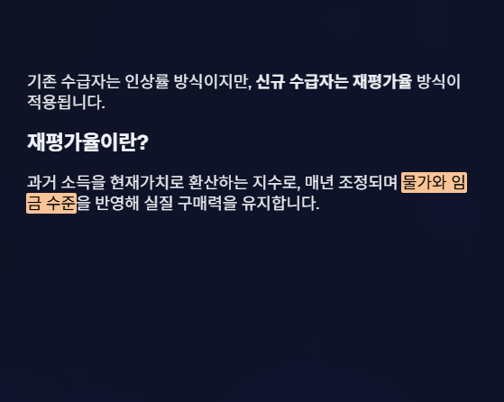 기존 수급자는 인상률 방식이지만, 신규 수급자는 재평가율 방식이 적용됩니다.
