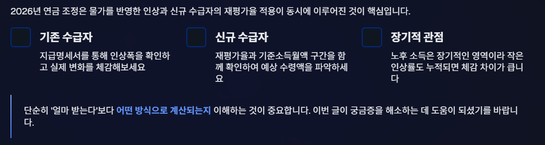 2026년 연금 조정은 물가를 반영한 인상과 신규 수급자의 재평가율 적용이 동시에 이루어진 것이 핵심입니다.
