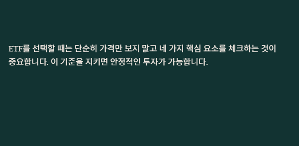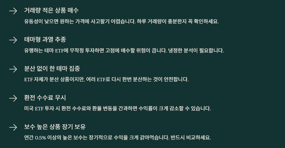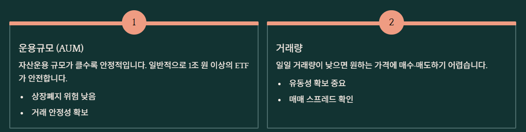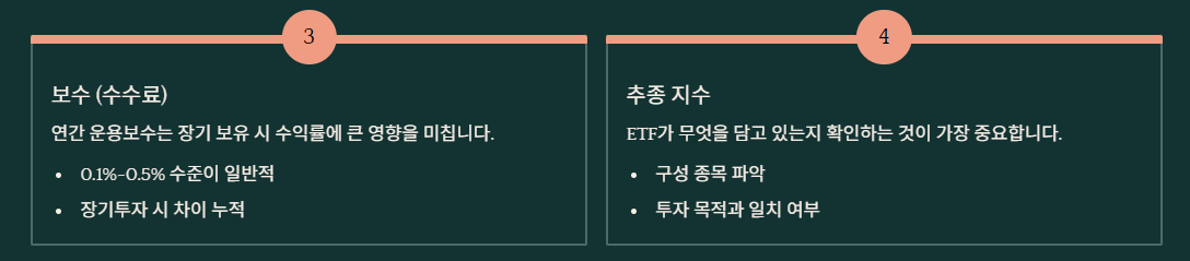 ETF를 선택할 때는 단순히 가격만 보지 말고 아래 네 가지를 체크하는 것이 중요하다.