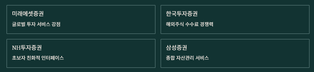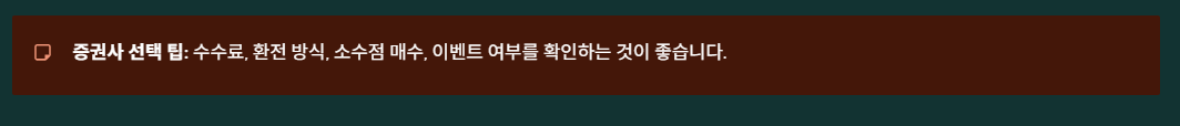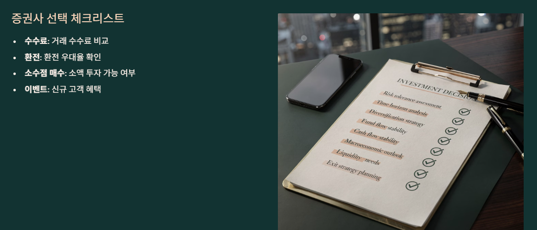 증권사 선택 시에는 수수료, 환전 방식, 소수점 매수, 이벤트 여부를 확인하는 것이 좋다.