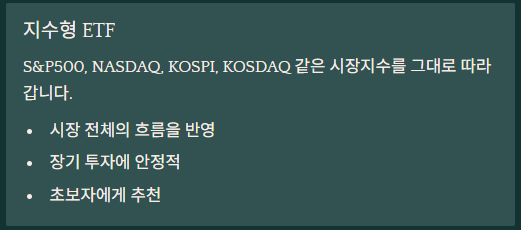 - 지수형: S&P500, NASDAQ, KOSPI, KOSDAQ 같은 시장지수를 그대로 따라간다.