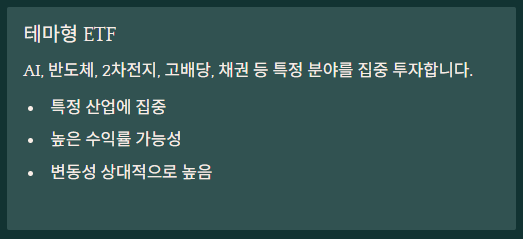 - 테마형: AI, 반도체, 2차전지, 고배당, 채권 등 특정 분야를 집중 투자한다.