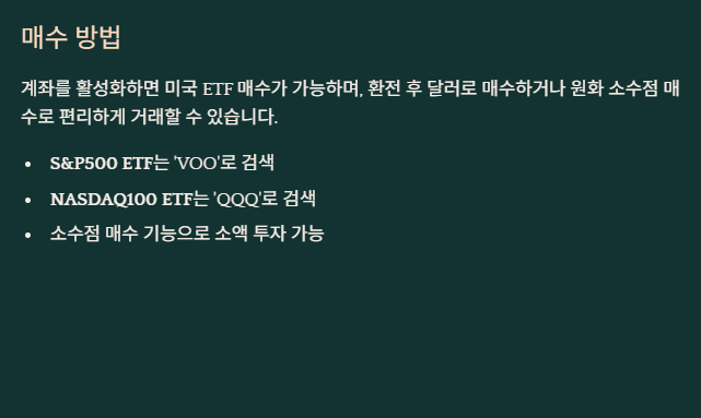계좌를 활성화하면 미국 ETF 매수 가능하며, 환전 후 달러로 매수하거나, 원화 소수점 매수로 편리하게 거래할 수 있다.