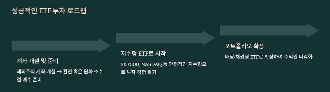 특히 미국 ETF를 선택할 경우, 해외주식 계좌 개설 → 환전 혹은 원화 소수점 매수 → ETF 매수 순서로 진행하면 초보도 쉽게 접근 가능하다.
