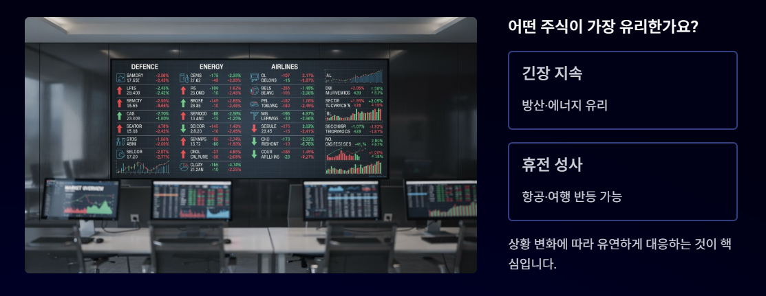 A. 상황에 따라 방산·에너지 또는 항공·여행 등으로 흐름이 바뀔 수 있어 유연한 대응이 중요합니다.