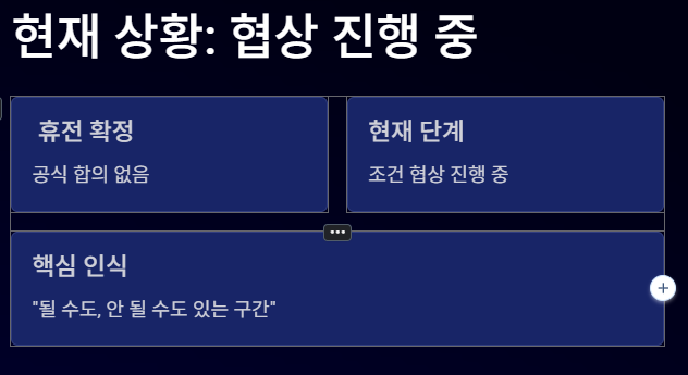 즉, 지금은 전쟁이 끝난 상황이 아니라 ‘될 수도 있고 안 될 수도 있는 구간’이라고 보는 것이 정확합니다.