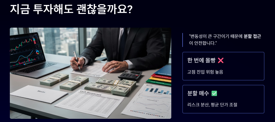 A. 변동성이 큰 구간이기 때문에 분할 접근이 안전합니다.