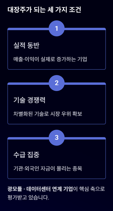 이 세 가지 조건을 만족하는 종목이 대장주로 움직입니다.