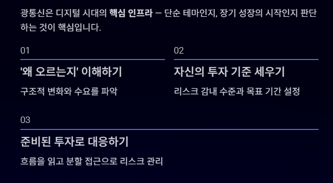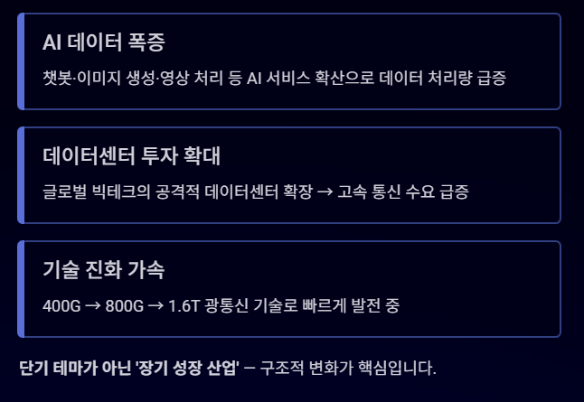 👉 즉, 광통신은 단기 테마가 아니라 ‘장기 성장 산업’이라는 점이 중요합니다.
