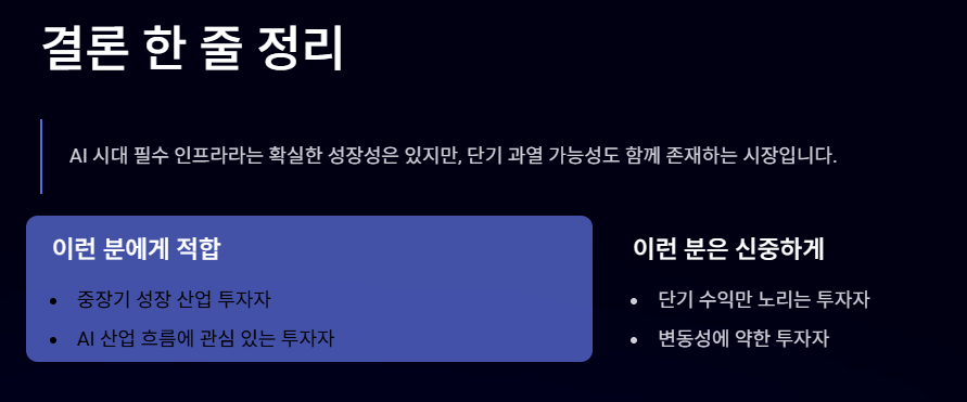 광통신 관련주는 “AI 시대 필수 인프라라는 확실한 성장성은 있지만, 단기 과열 가능성도 함께 존재하는 시장”입니다.